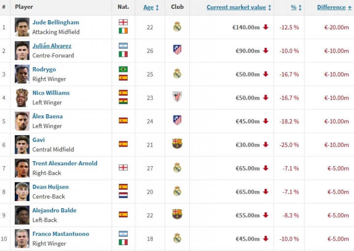 西甲身价跌幅榜:贝林跌2000万居首,小蜘蛛、罗德里戈跌1000万