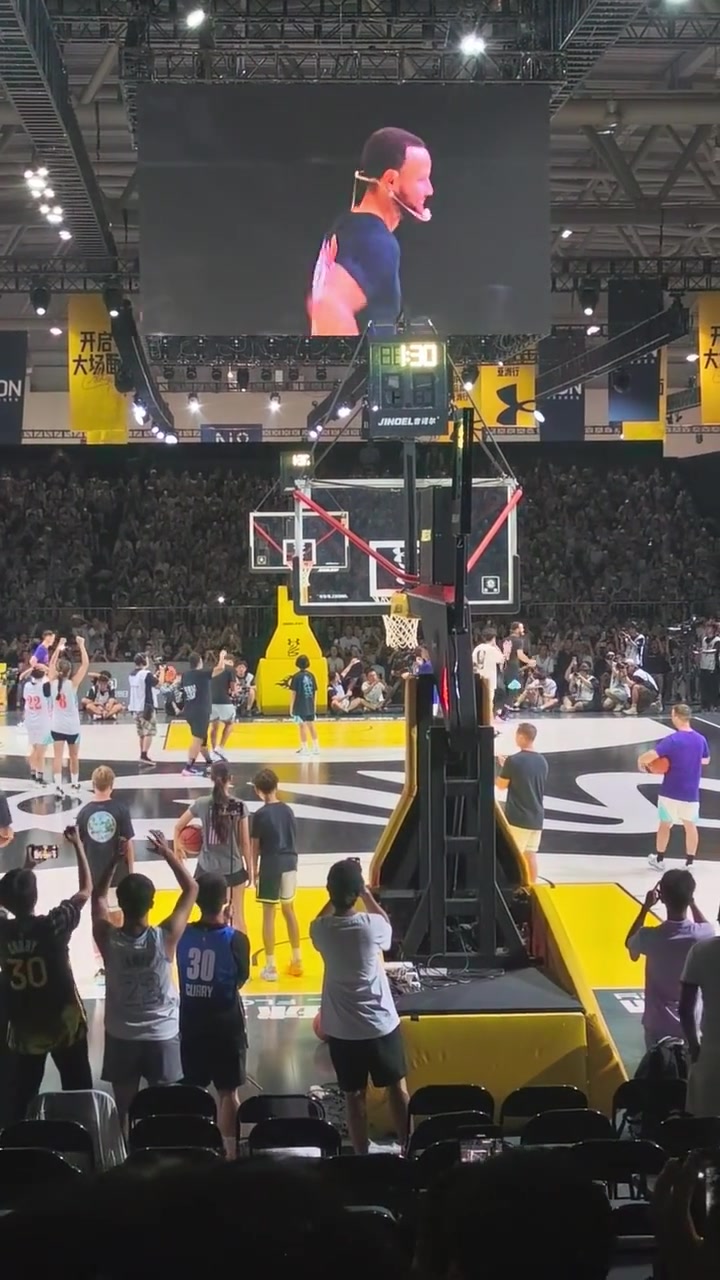 都不白来!库里现身重庆国博中心 为球迷展示单臂扣篮